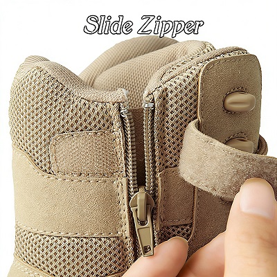 The slide side zipper and Velcro closure provide easy on-and-off access, offering a secure fit and quick adjustments for added convenience and comfort. |