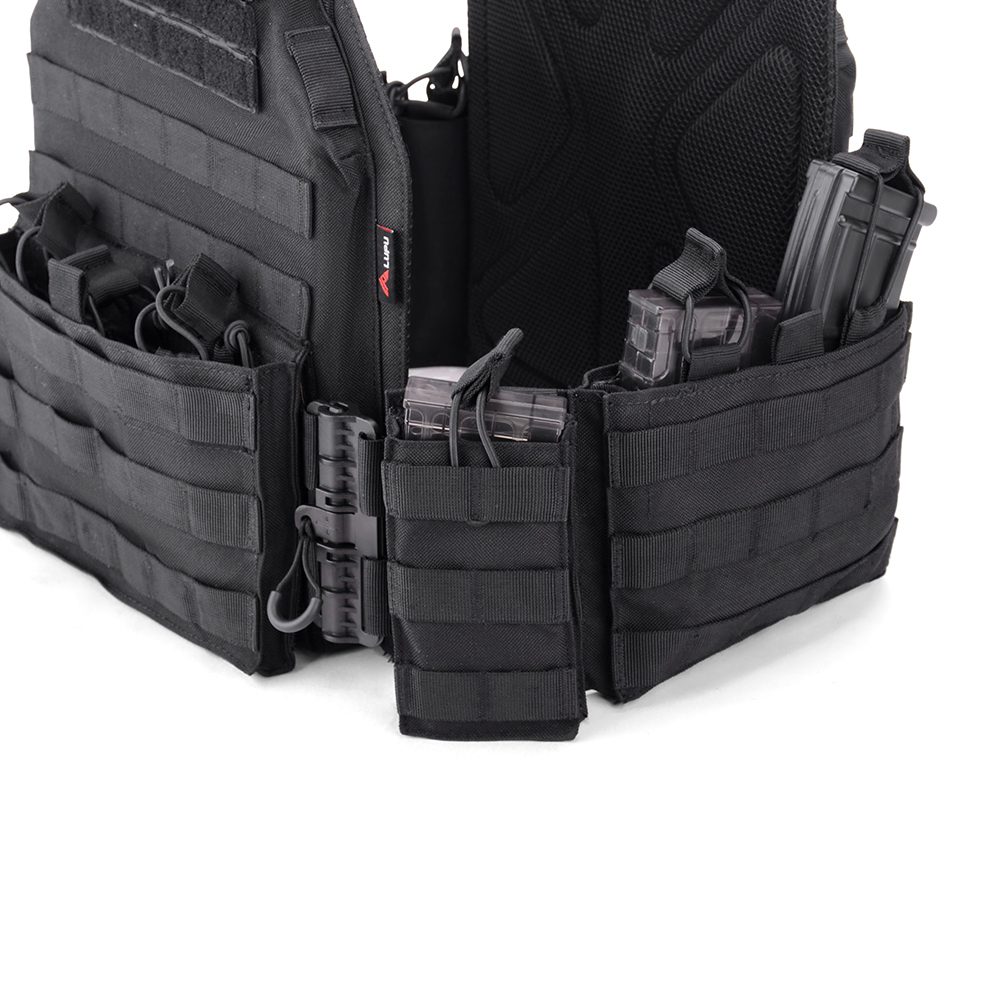 This tactical vest features a MOLLE system on the front and sides, allowing for compatibility with magazine pouches to securely store ammunition while facilitating rapid access. |