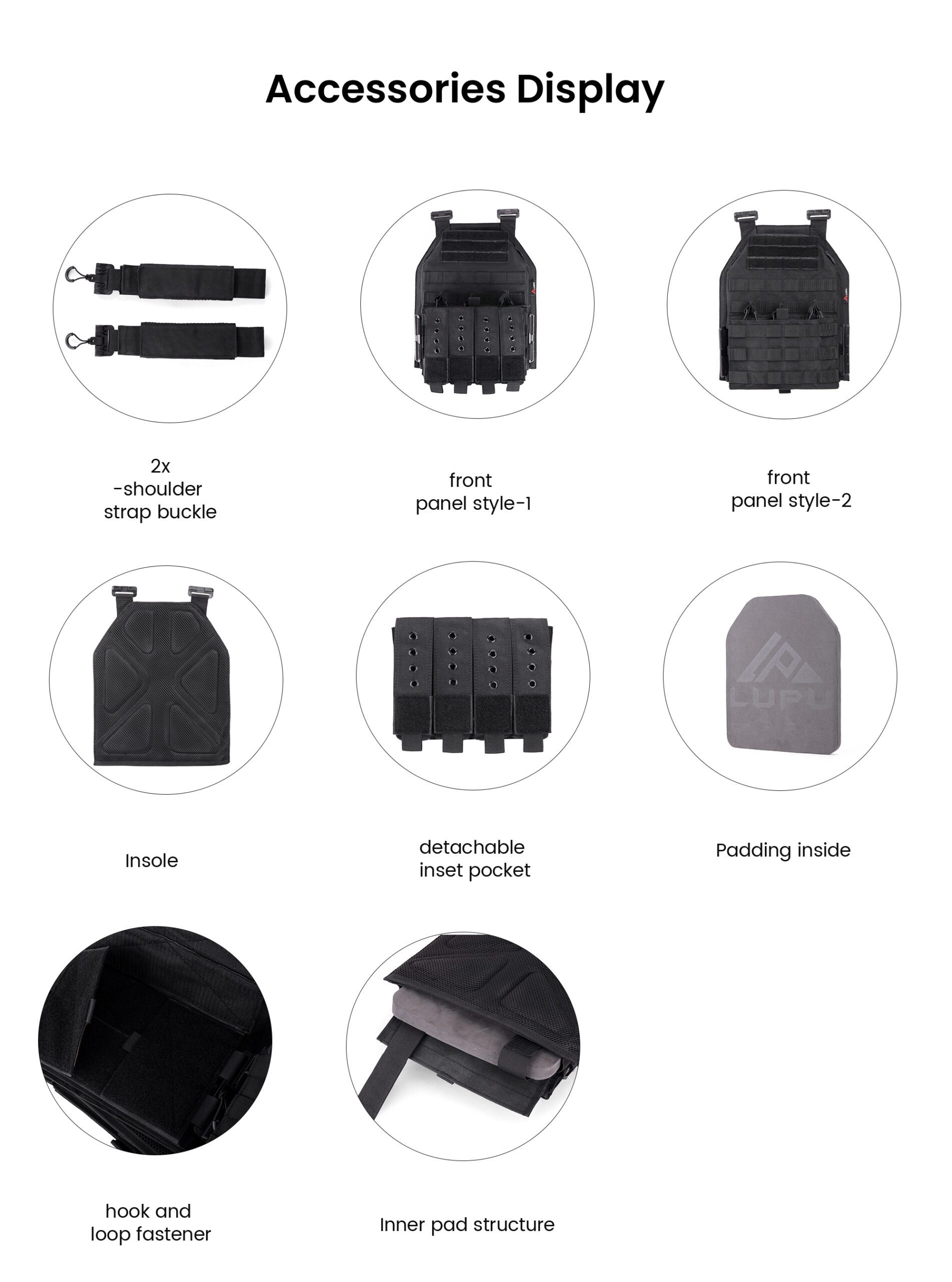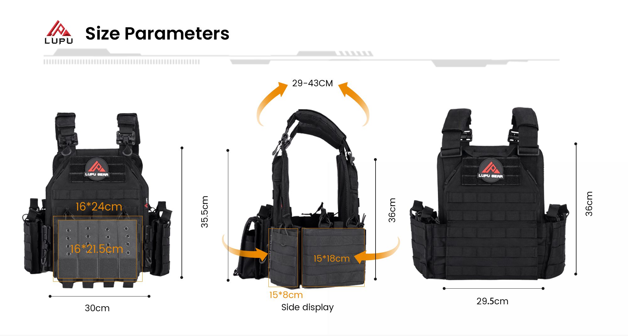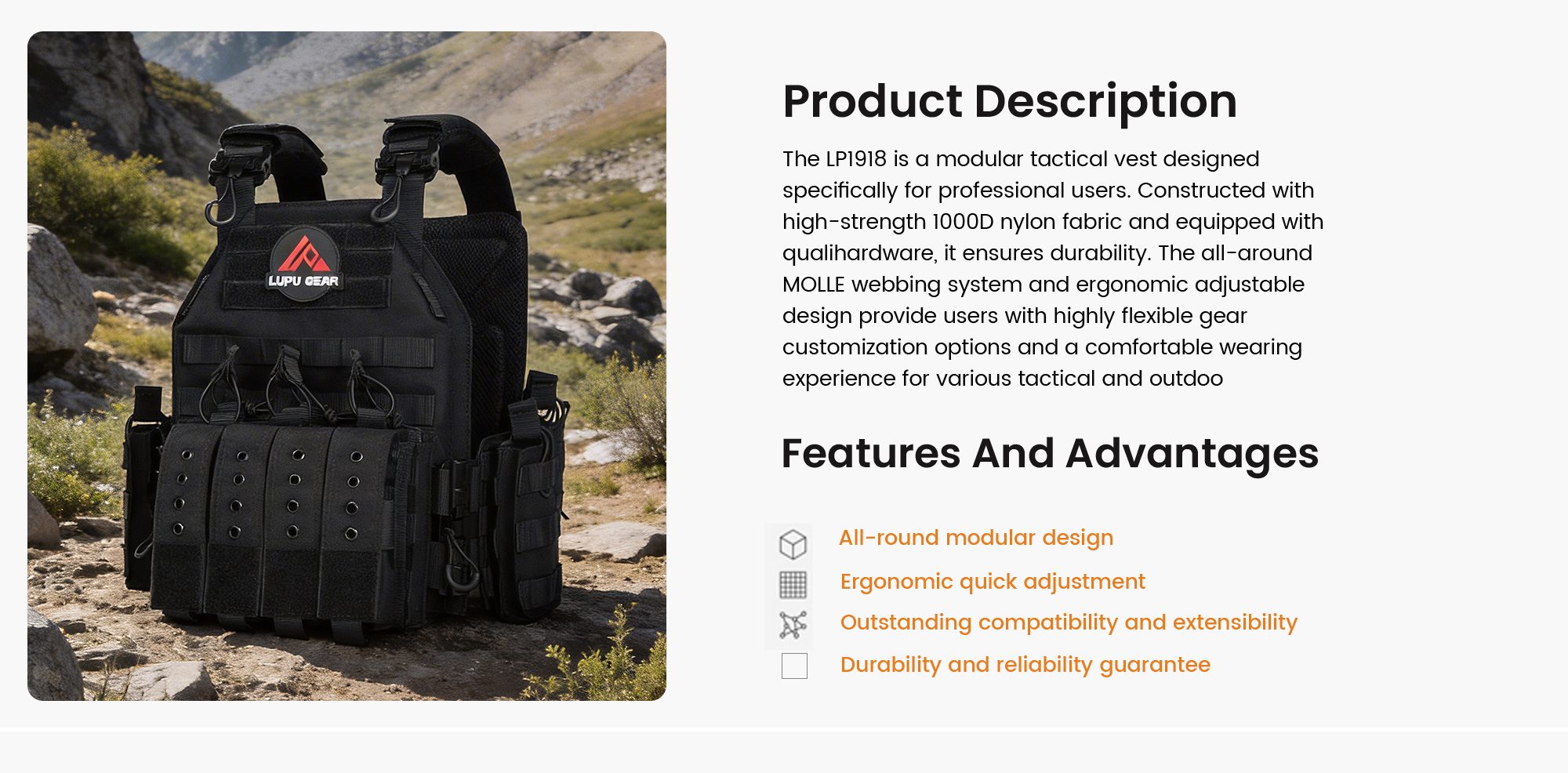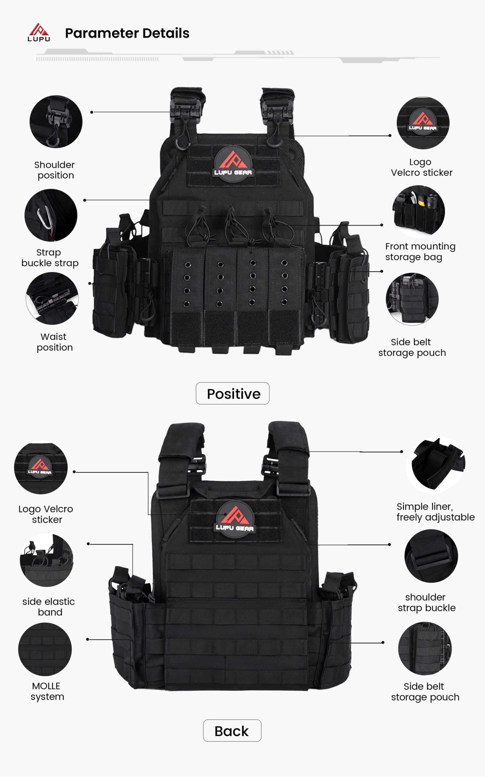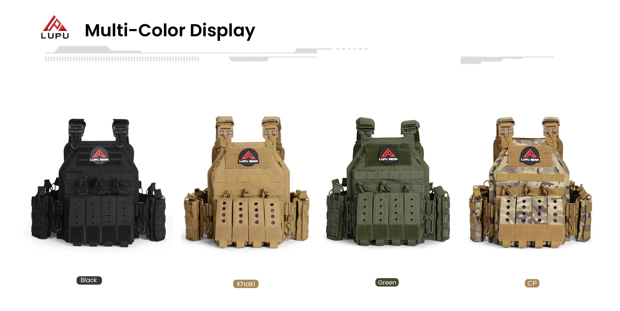 The LUPU LP1918 military tactical vest with plate, crafted from durable 1000D nylon, features quick-release functionality, MOLLE webbing on front, back, and magazine pouches, and secure plate pockets. Designed for military and outdoor use, it offers customizable load-carrying options and reliable comfort for extended operations.