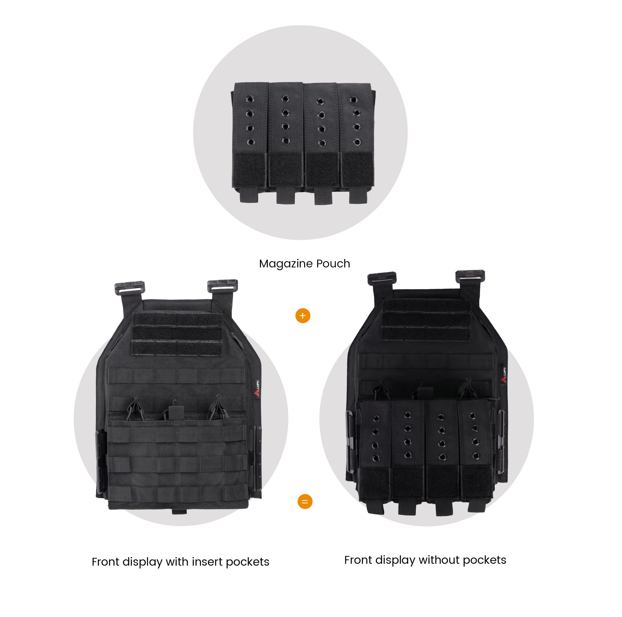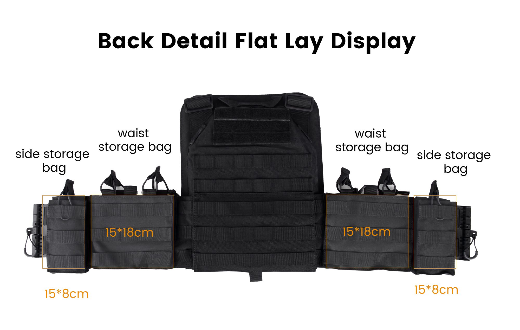 This tactical vest swed MOLLE webbing on the front, back, and side magazine pouches, providing additional storage space. |