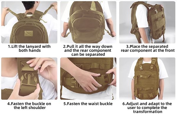 This dual-use vest tactical backpack can be used as both a backpack and a vest, and equipped with MOLLE Module. Ideal for outdoor adventures or daily use, this compact yet spacious backpack ensures comfort, style, and functionality.