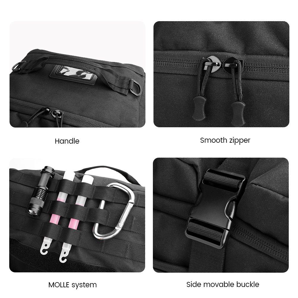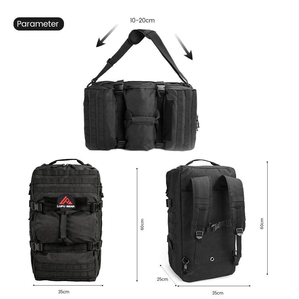 The LUPU Large Tactical Backpack LP1753 is a high-performance, 52L capacity backpack designed for rugged use. Made with durable 900D black Oxford fabric, this waterproof tactical backpack ensures long-lasting reliability in any environment. Featuring MOLLE webbing for customizable storage, it allows easy attachment of pouches, tools, and accessories. Its spacious main compartment, detachable baffle, and adjustable straps offer optimal organization and comfort. Ideal for military, outdoor enthusiasts, or emergency preparedness, this backpack combines practicality with durability. Perfect for B2B clients seeking quality tactical gear.