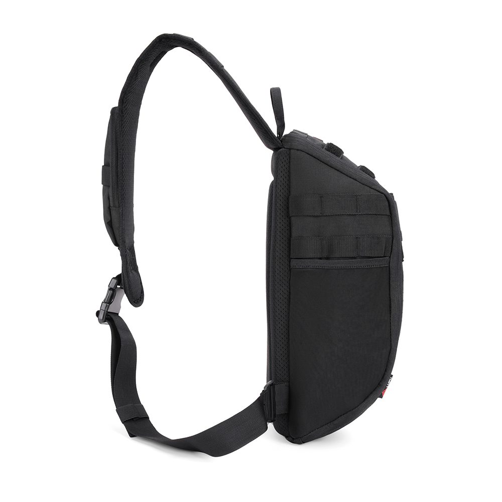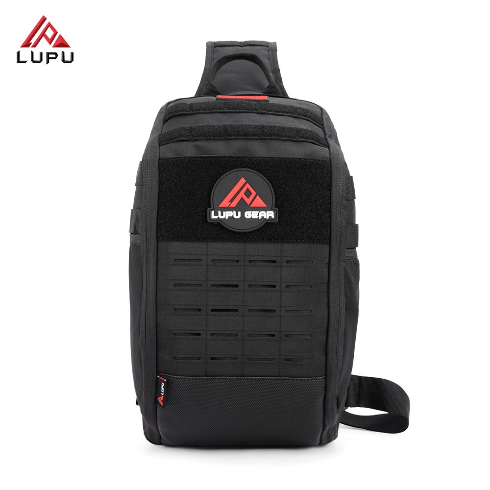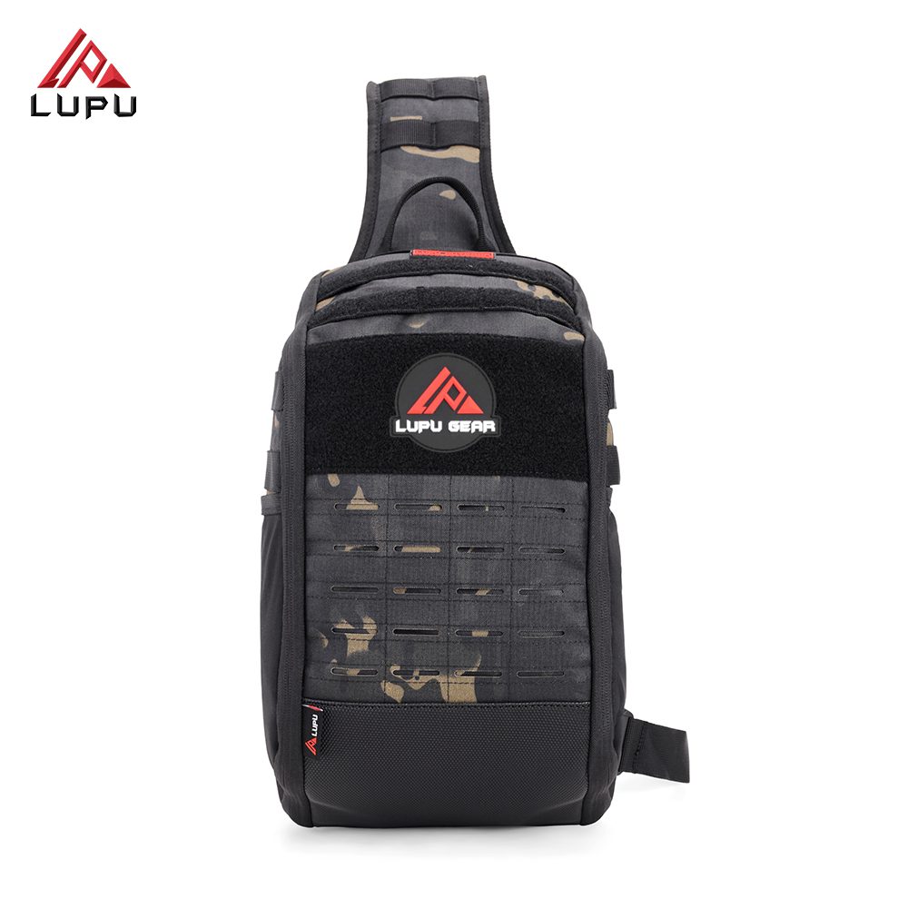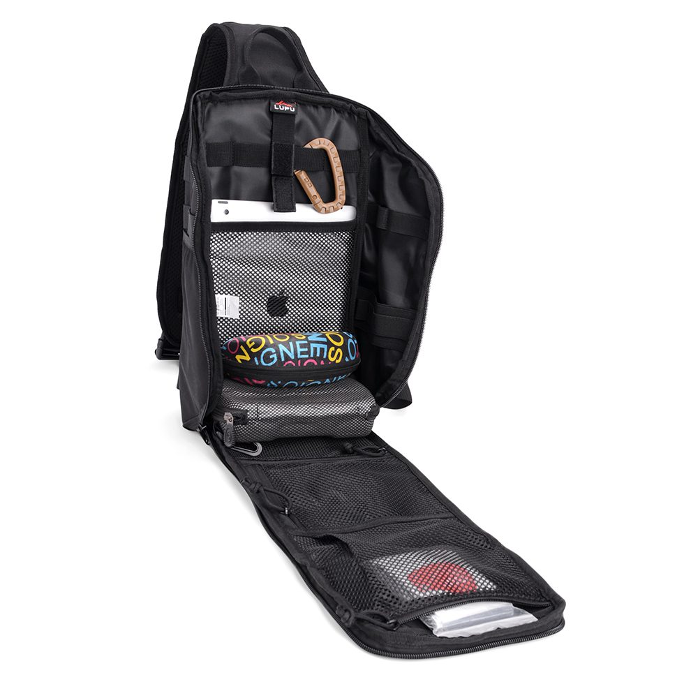 LUPU LP2133 Laser-Cut Molle Tactical Black Sling Bag in durable 500D nylon offers lightweight, versatile storage for urban, outdoor, military, or law enforcement use. Features include customizable front Velcro panel, secure hidden and side zipper pockets, and organized internal compartments—designed for convenience, durability, and modern tactical style.