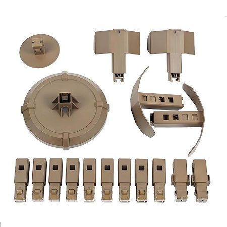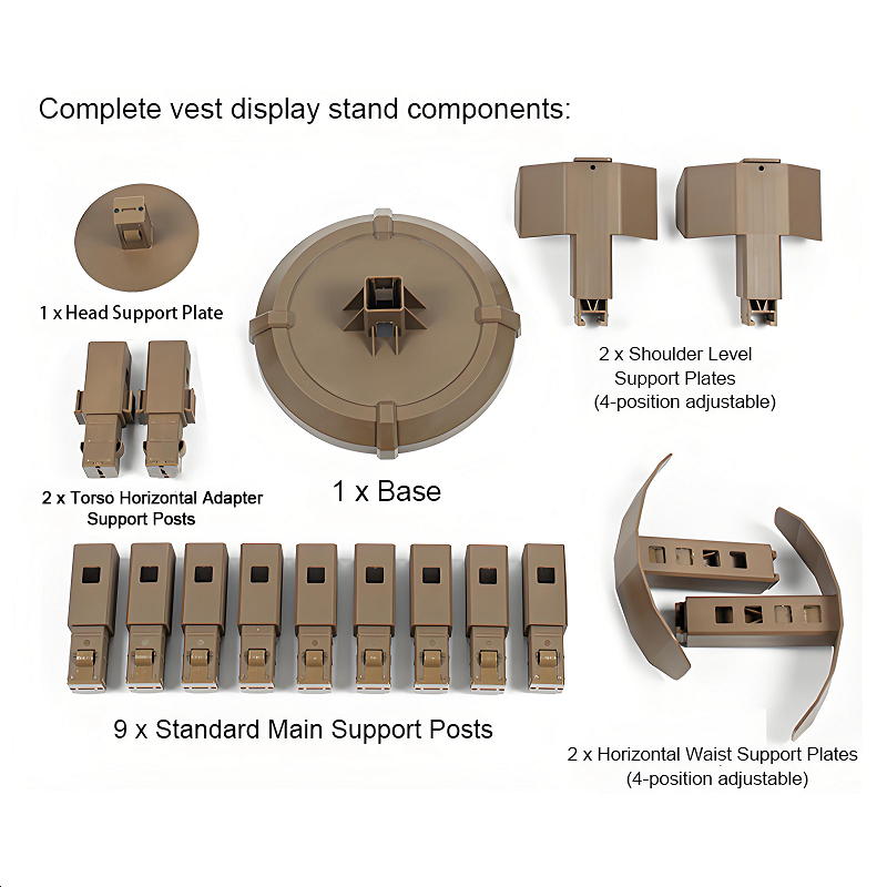 Componentes completos do expositor de coletes: 1 x placa de apoio da cabeça; 2 x placas de apoio ao nível dos ombros (ajustáveis em 4 posições); 2 x postes de apoio do adaptador horizontal do tronco; 1 x base; 9 x postes de apoio principal padrão; 2 x placas de apoio horizontal da cintura (ajustáveis em 4 posições) |