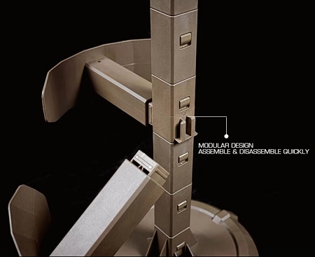 Regulação livre da altura: Pode ajustar a altura do suporte para facilitar o armazenamento de diferentes tamanhos de equipamento. Também pode ajustar os braços em diferentes posições para destacar o seu vestuário em vários níveis. |