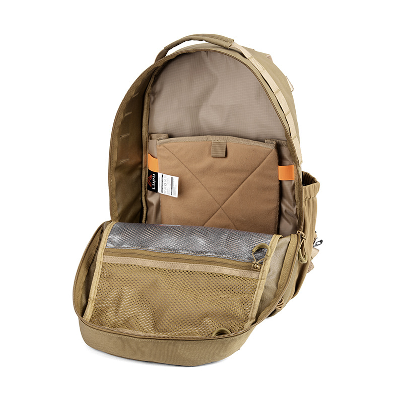 The bottom of the backpack is reinforced with MOLLE webbing for added customization and utility. It also includes a discreet zippered pocket for secure storage of small essentials, combining functionality with stealth. |