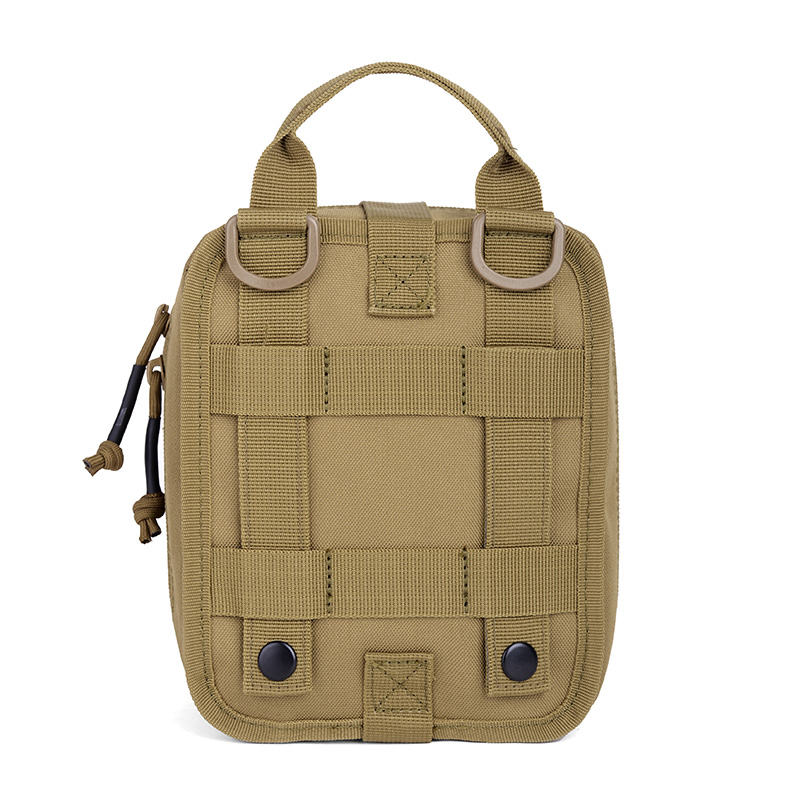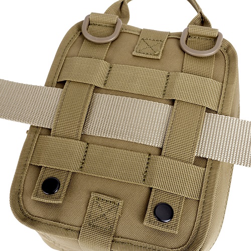 The back of this bag is equipped with durable MOLLE webbing, allowing for easy attachment to tactical vests, belts, or backpacks for enhanced customization. This bag features two D-rings at the top of the back panel, providing multiple attachment options for secure carrying or quick access to items in tactical and outdoor environments. |
