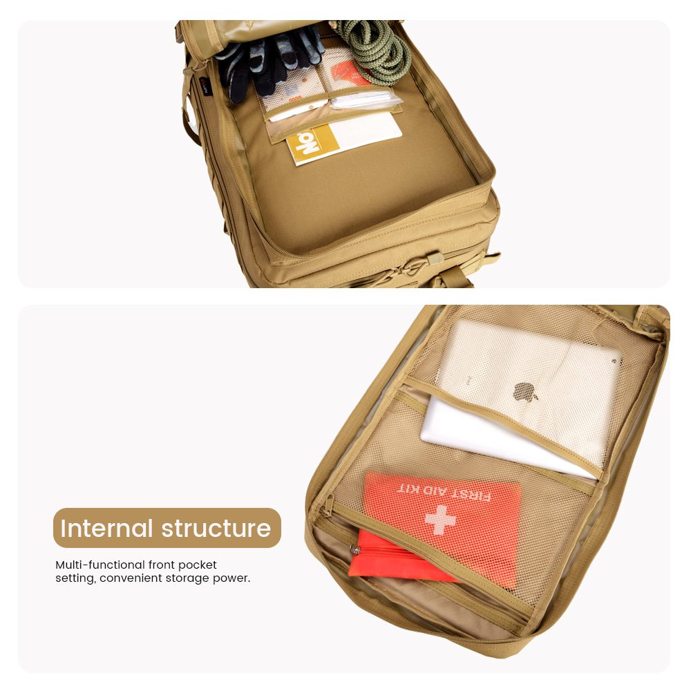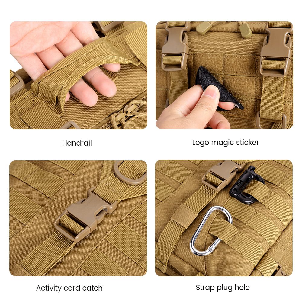 Handrail, Logo Magic Sticker, Activity Card Catch & Molle Design: This tactical backpack for men features a convenient top handle for easy carrying, ensuring effortless switching between different carrying methods during your travels. The unique Velcro logo design allows for easy removal and replacement, facilitating personalized customization. The adjustable buckle design makes it easy to attach and detach the shoulder straps, improving efficiency and convenience. Furthermore, the MOLLE system design enhances the backpack's versatility, allowing you to attach various accessories as needed, creating your own customized gear. Whether for tactical missions, outdoor adventures, or everyday use, this backpack offers exceptional functionality and adaptability. |