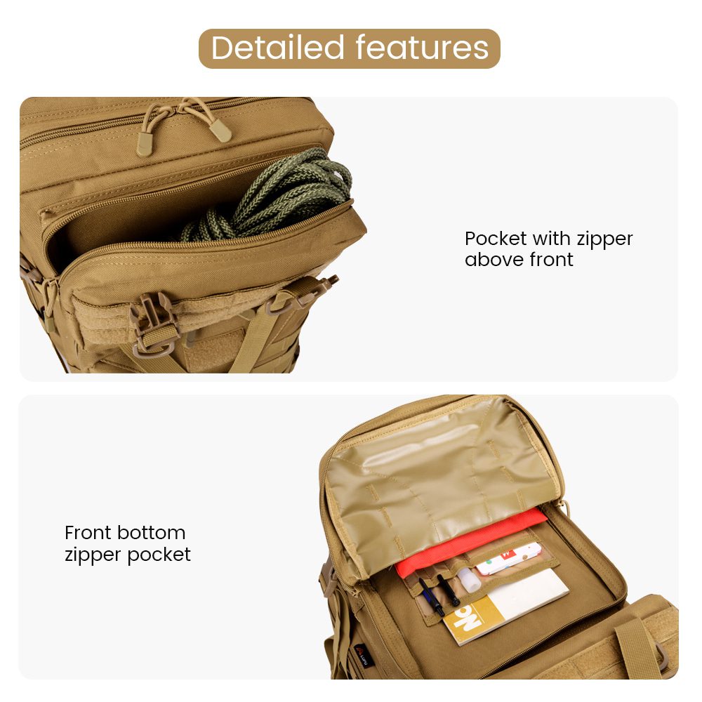 Front Upper Zipper Pocket & Lower Zipper Pocket Design: The front upper and lower zipper pockets are thoughtfully designed for easy organization and quick access to essentials. The upper pocket provides convenient storage for smaller items, while the lower pocket offers ample space for larger gear. Both zippers ensure secure closure, keeping your belongings safe and organized. Ideal for both tactical and everyday use, this design enhances functionality and convenience, making it a perfect choice for professionals and outdoor enthusiasts alike. |