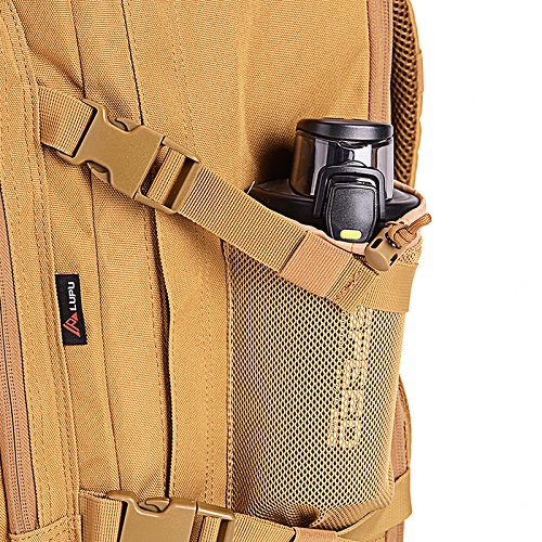 The bag includes a mesh water bottle pocket on the right side, offering convenient storage for hydration while keeping your hands free during outdoor activities. |