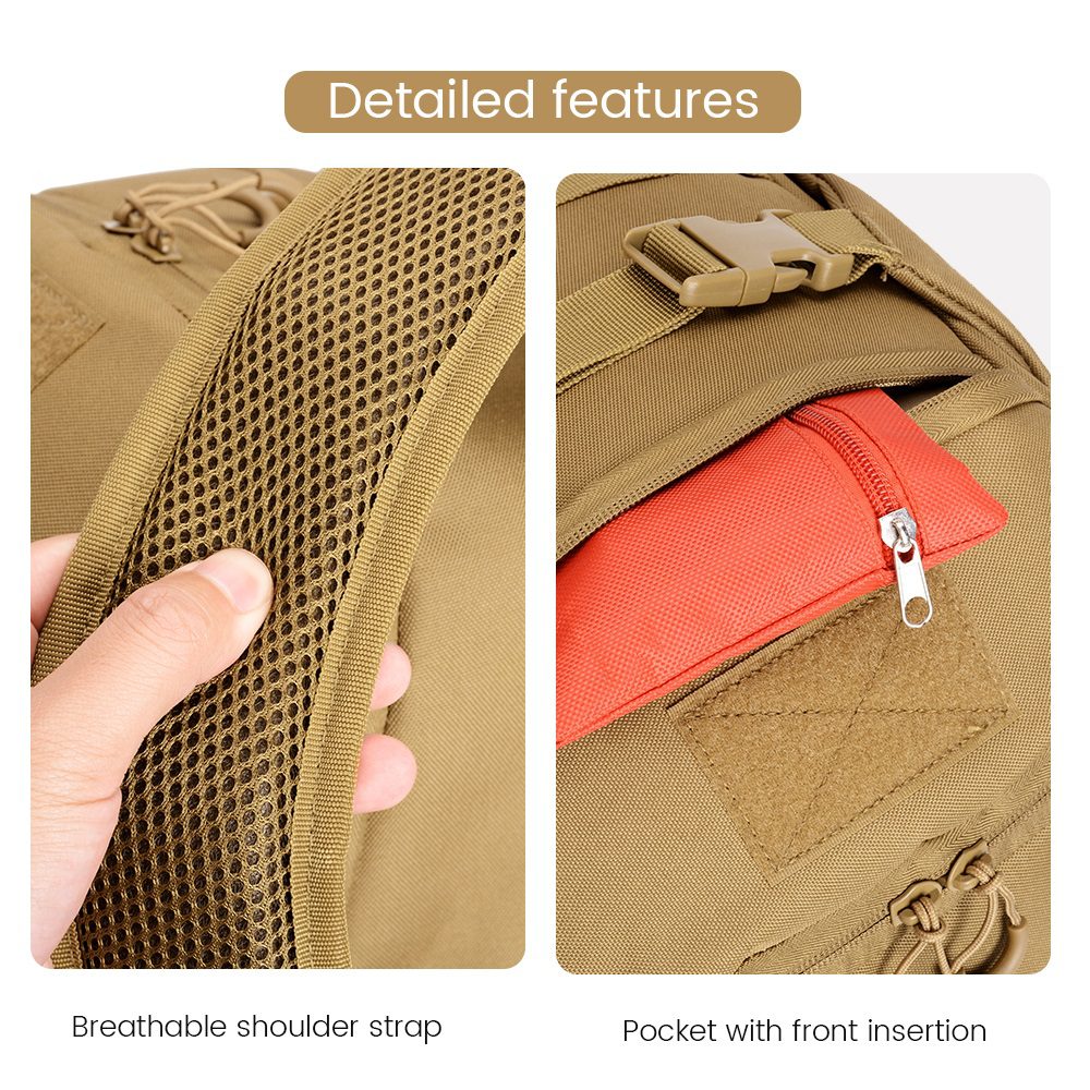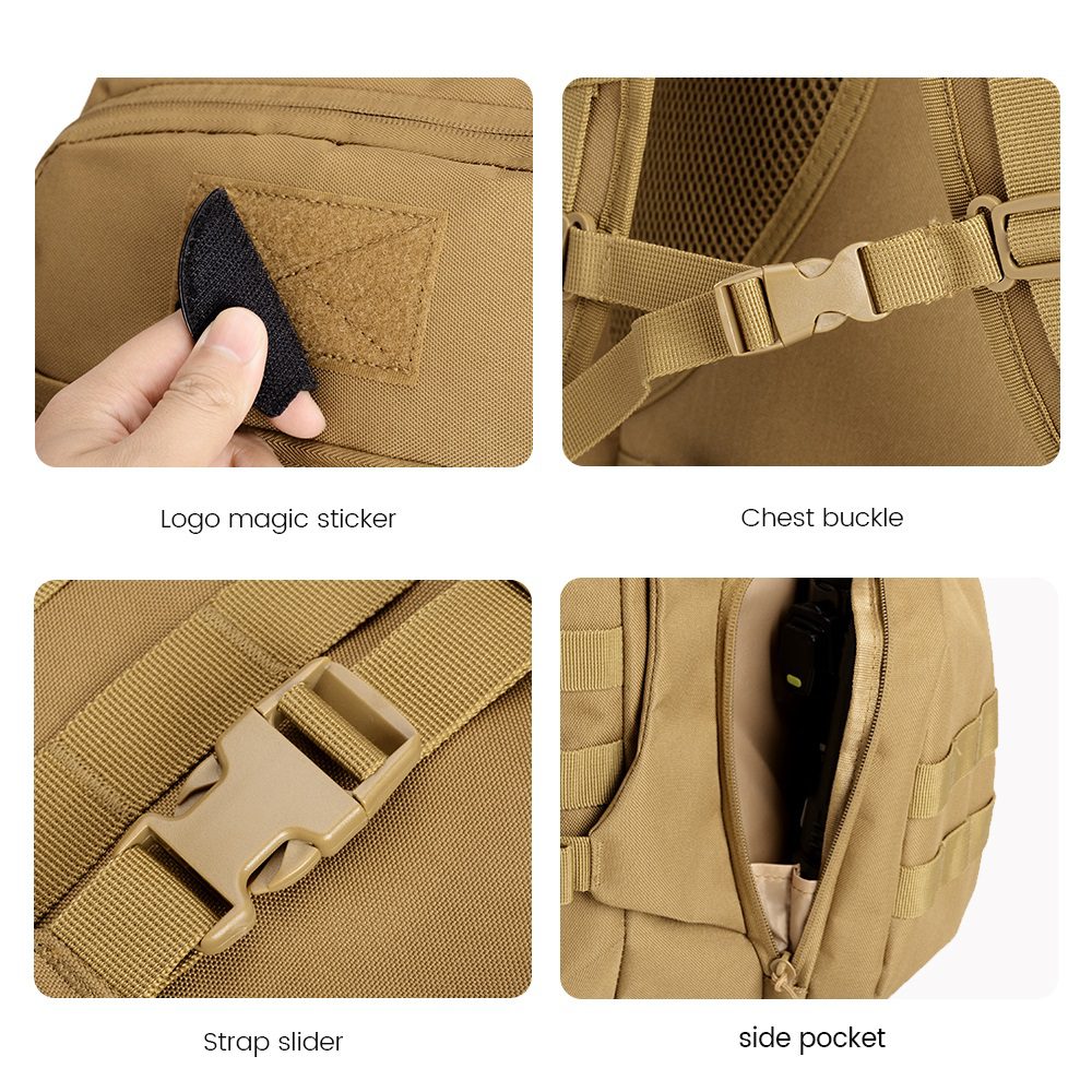 Logo magic sticker, Chest buckle, Strap slider & Side pockets Design: Design enhance both functionality and style. With customizable logo placement, secure chest straps, adjustable sliders, and convenient side pockets, this design ensures comfort, durability, and practicality for all your outdoor and tactical needs. |