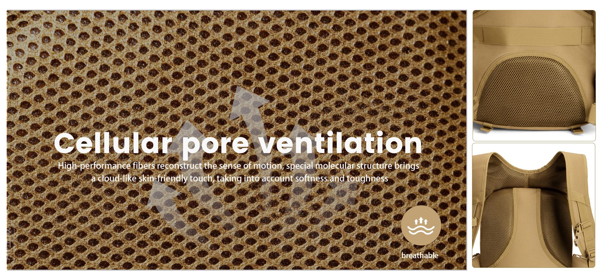 Shoulder & Coccygeal mesh ventilation design: The shoulder and coccygeal mesh ventilation design enhances airflow, ensuring maximum comfort during extended wear. It helps reduce sweat and heat buildup, keeping you cool and dry during outdoor activities or long trips. |