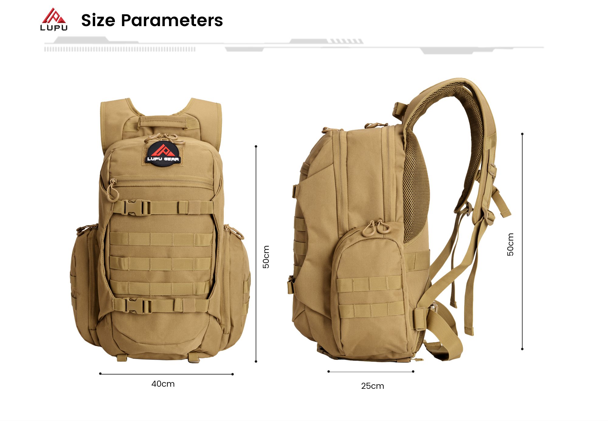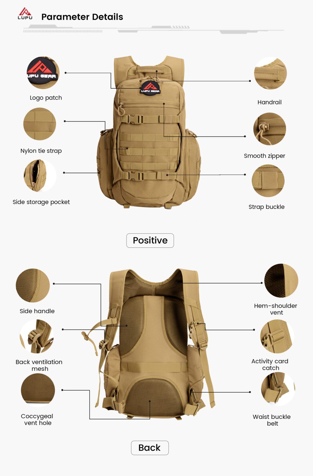 Logo magic sticker, Chest buckle, Strap slider & Side pockets Design: Design enhance both functionality and style. With customizable logo placement, secure chest straps, adjustable sliders, and convenient side pockets, this design ensures comfort, durability, and practicality for all your outdoor and tactical needs. |